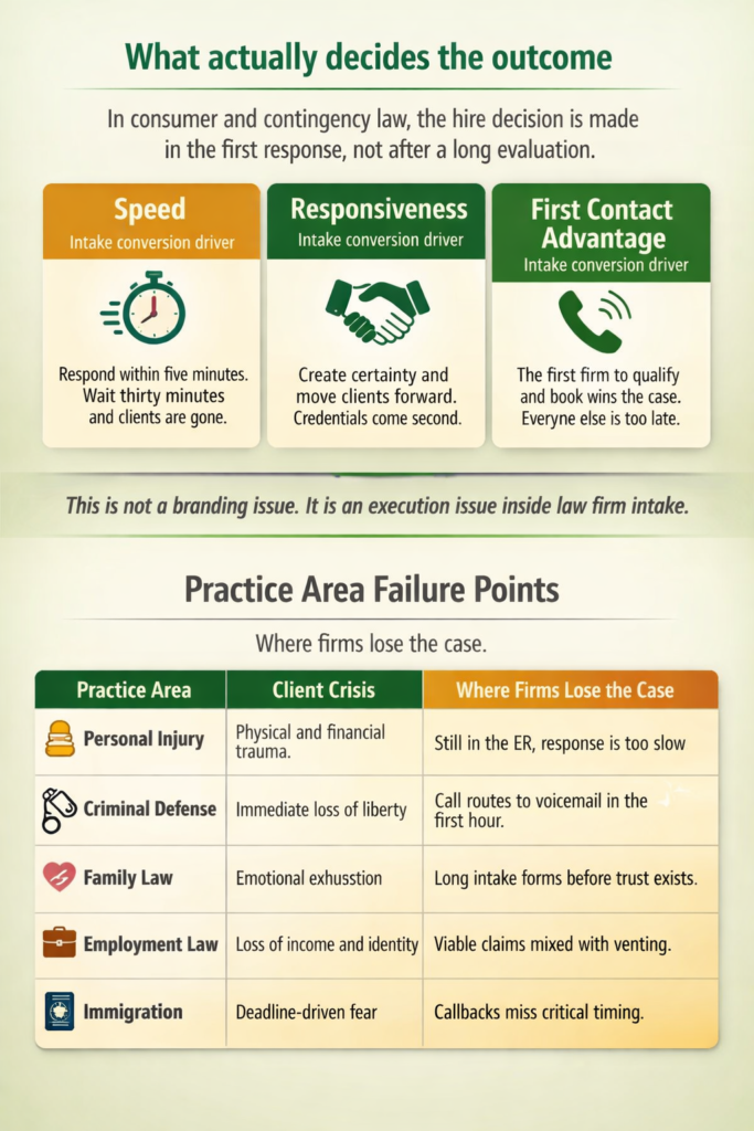 In consumer and contingency practices, the hire decision is usually made during the first response, not after a long evaluation.
